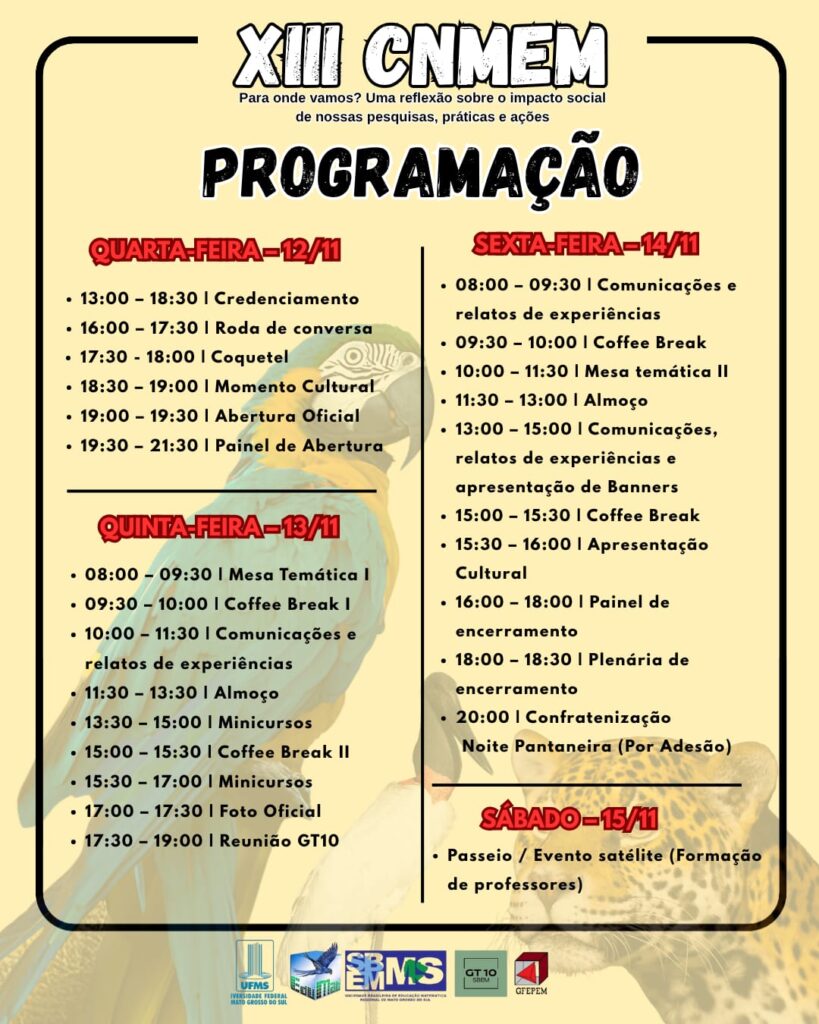 A XIII CNMEM será realizada nos dias 12, 13 e 14  de 2025, no Campus Centro da UFMS (Cidade Universitária, Av. Costa e Silva – Pioneiros, MS). Confira mais detalhes: